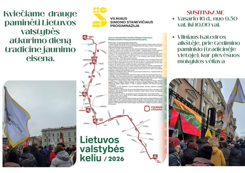 Eisime iš Šventaragio slėnio, nuo Valdovų rūmų, kur prieš septynis šimtmečius rašyti Gedimino laiškai, pro Signatarų namus, Didžiojo Vilniaus seimo rūmus, Aušros Vartus į Rasų kapines. Pagerbsime daktarą Joną Basanavičių, Vasario 16-osios akto signatarus, sukilėlius bei savanorius, žuvusius už Tėvynės laisvę. Tai kelias, jungiantis mus su Lietuvos valstybe ir jos kūrėjais.