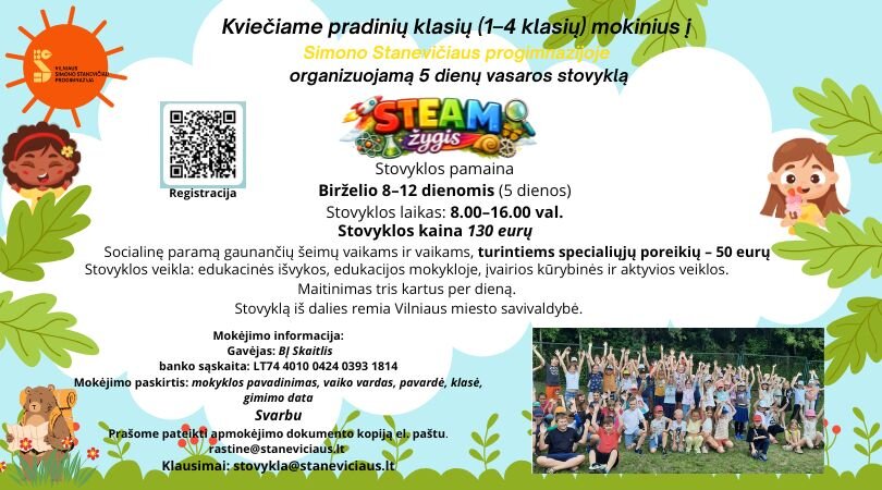 Simono Stanevičiaus progimnazija kviečia 1–4 klasių mokinius į vasaros stovyklą, kuri vyks birželio 8–12 dienomis, kasdien nuo 8.00 iki 16.00 val.