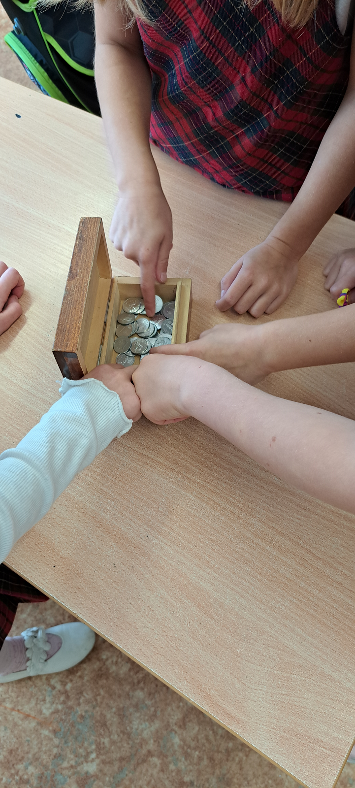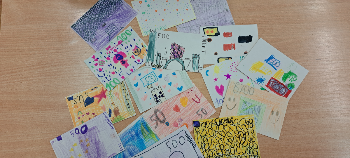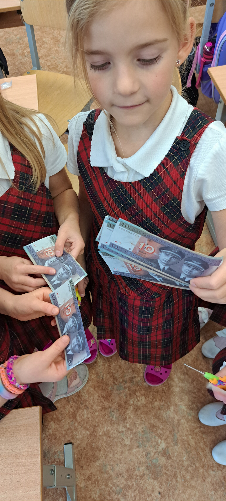 Verslumo ir finansinio raštingumo 1b klasės mokiniai (pradinio ugdymo vyresnioji mokytoja Aušra Ilgevičienė) per verslumo ir finansinio raštingumo pamokas sužinojo, kas yra tie pinigai. Kaip pavadinti žvangančius ir šiugždančius pinigus. Su smalsumu tyrinėjo monetas ir banknotus. Surado pinigėlių apsaugos požymius. Dailės ir technologijų pamokose, pasinaudodami Lietuvos Junior Achievement metodine medžiaga, kūrė savo pinigėlį.