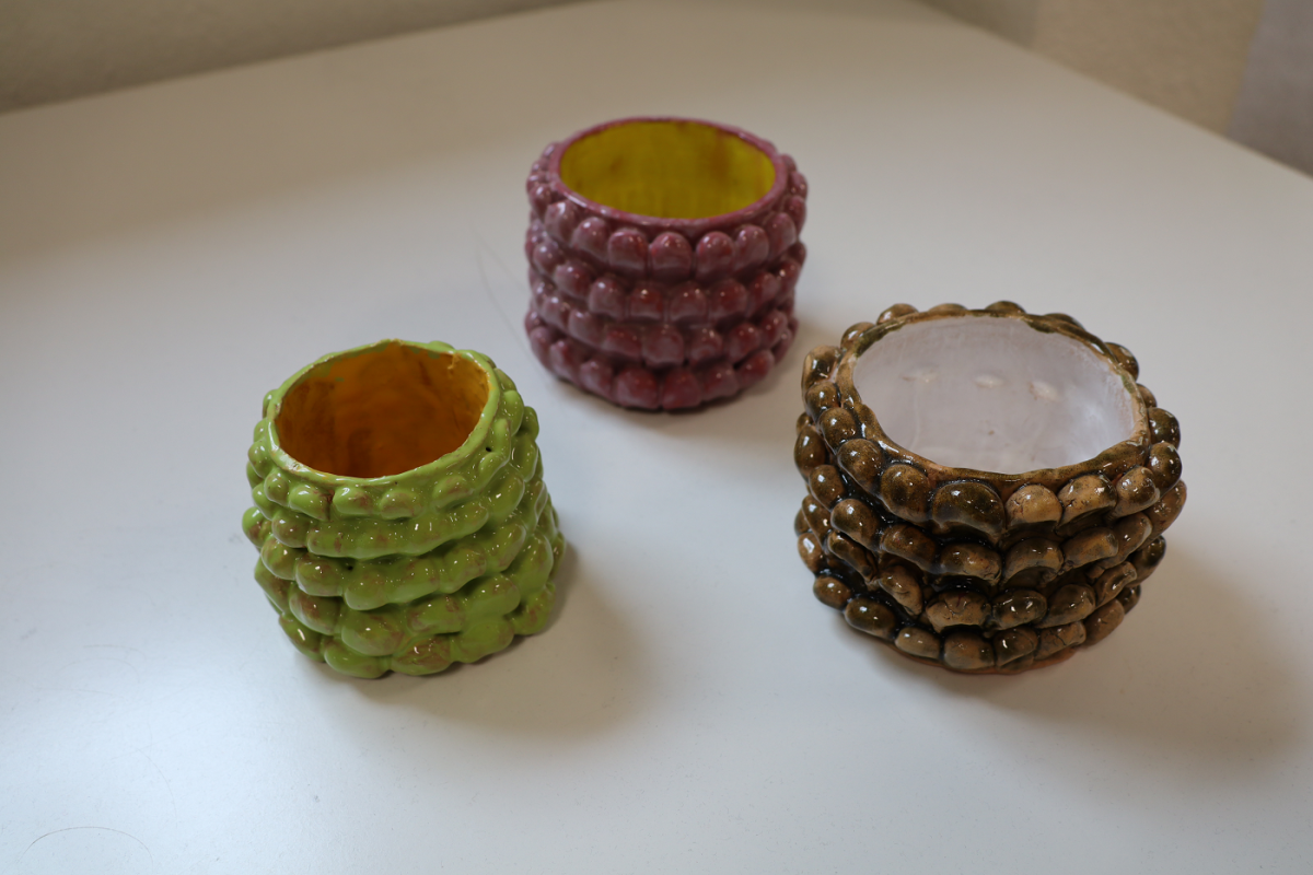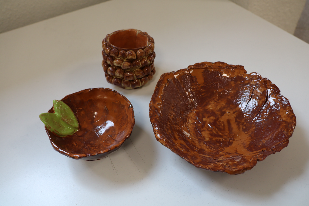 Kūrybiniame procese buvo naudojamos rudos ir gelsvos spalvos molio masės. Dirbiniai dekoruoti ir glazūruoti itališkomis ir čekiškomis glazūromis, kurios suteikė darbams subtilius atspalvius.
