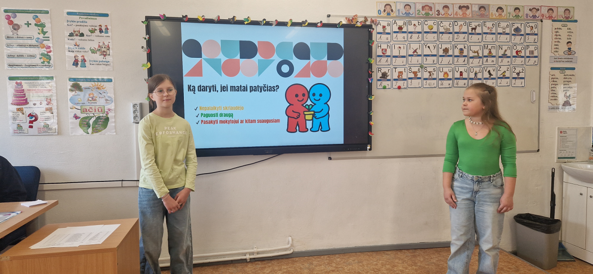 Ypač didžiuojamės 4e klasės mokiniais, kurie vedė prevencines pamokėles pirmų klasių mokiniams. Jie dalijosi žiniomis apie patyčias, diskutavo ir skatino jaunesniuosius būti draugiškais bei padėti vieni kitiems. Taip pat Mokinių taryba, jaunieji MEPA ambasadoriai, kaip ir kasmet, organizavo prevencines pamokas „NETYLĖK“ 3–4 klasių mokiniams.