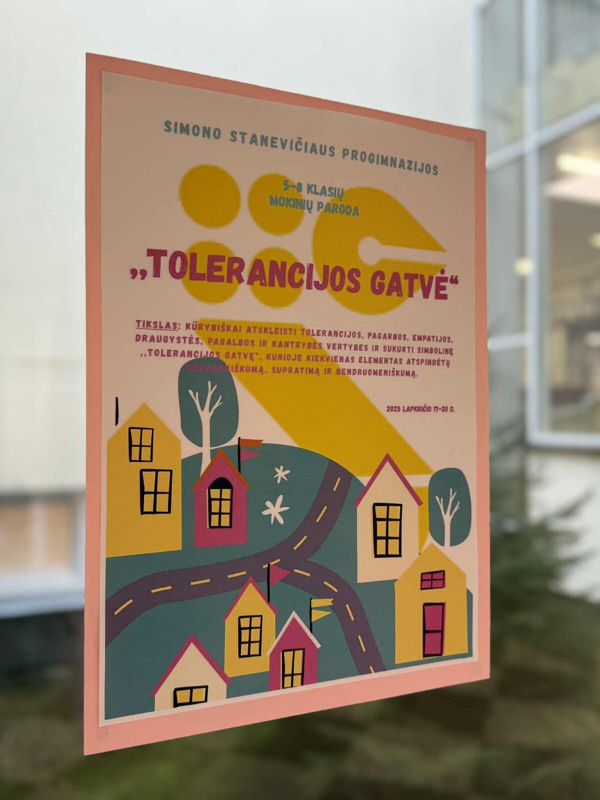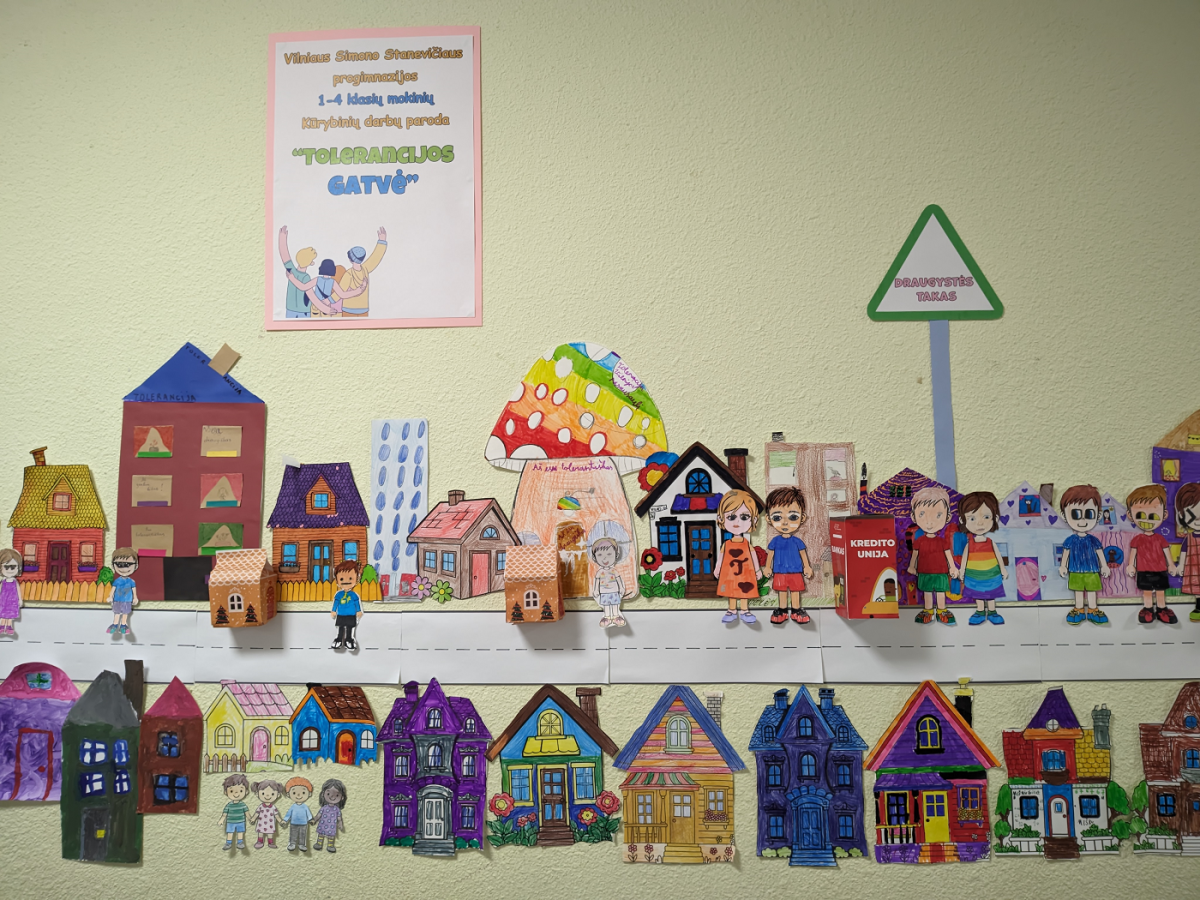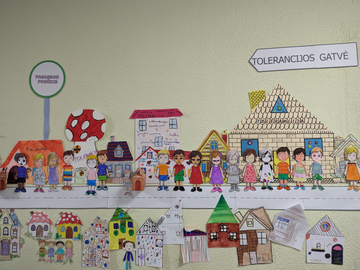 1-4 klasių mokiniai kartu su mokytojais dalyvavo kūrybinėse dirbtuvėse, kuriose gamino įvairiaspalvius tolerancijos namelius. Juos sujungę sukūrė bendrą „Tolerancijos gatvę“, simbolizuojančią saugią, draugišką ir atvirą bendruomenę. Kiekvienas namelis buvo savitas – mokiniai jį puošė žinutėmis apie