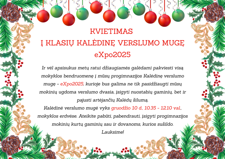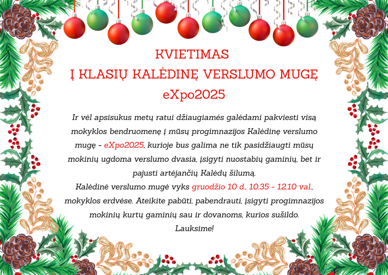 Maloniai kviečiame mokyklos bendruomenę į 1–8 klasių Kalėdinę verslumo mugę eXpo2025, kuri vyks gruodžio 10 d. nuo 10.35 val. iki 12.10 val. mūsų progimnazijos erdvėse.