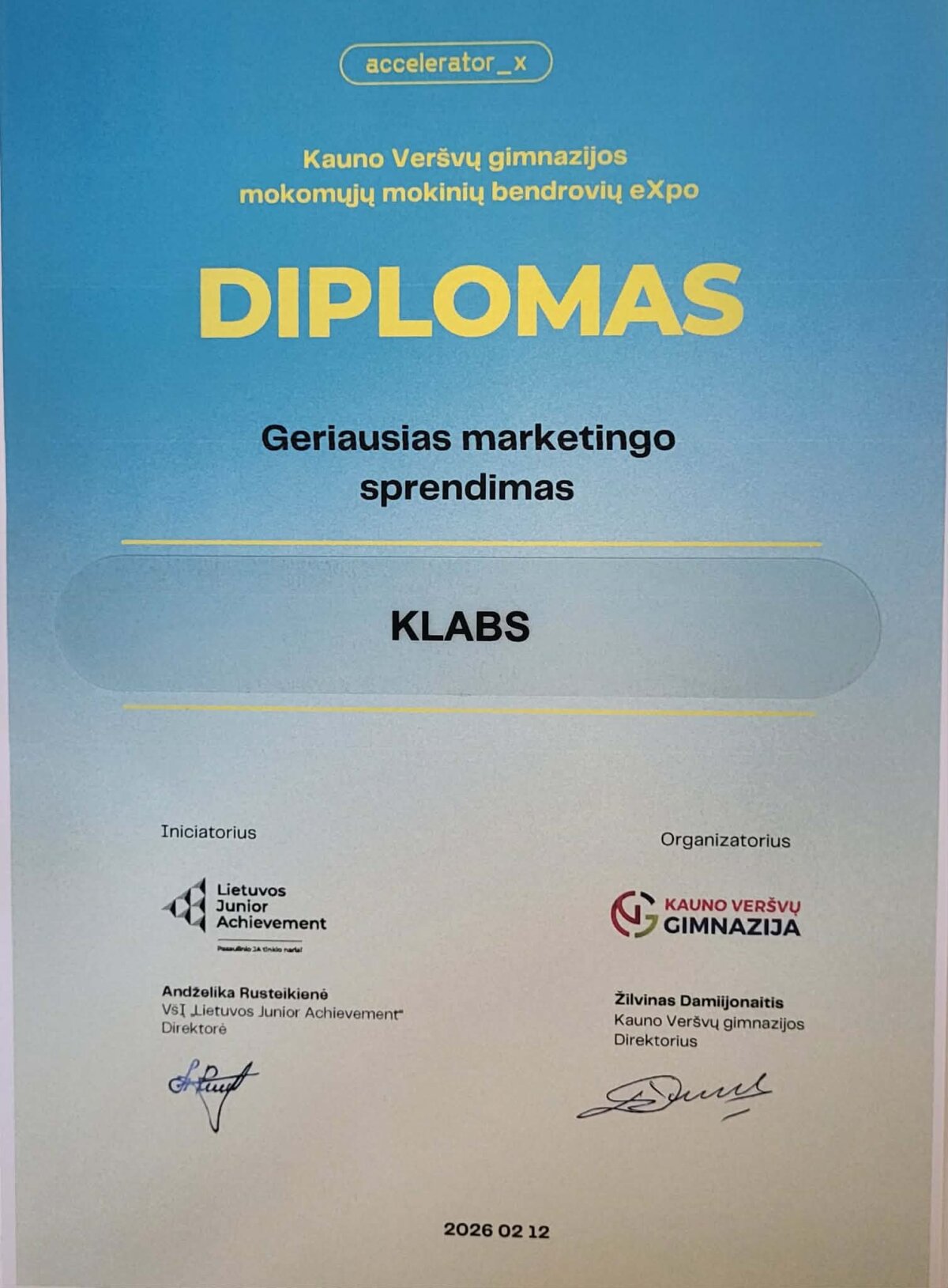 vasario 12d. Kauno Veršvų gimnazijoje vyko 5-12 klasių mokinių mokomųjų bendrovių verslumo renginys Veršvų EXPO, į kurį buvo pakviesti mūsų progimnazijos mokytojai ir mokiniai. Mokyklai atstovavo 8b klasės mokiniai: Agnė Babrauskaitė, Liepa Došaitė, Klėja Došaitė, Beatričė Jasaitytė, Smiltė Mikėnaitė, Motiejus Meidus, Lukas Peseckas, Faustas Petrauskas. Mokinius lydėjo technologijų vyresnioji mokytoja Asta Stakauskaitė ir dailės mokytoja ekspertė Jurga Sidabrienė. Mokinių mokomosios bendrovės buvo taip pat komisijos vertinamos. Džiugu, komandai KLABS skirta "Geriausio marketingo sprendimo" nominacija, komanda BLOCKODILES sulaukė didelio susidomėjimo ir naujų užsakymų!