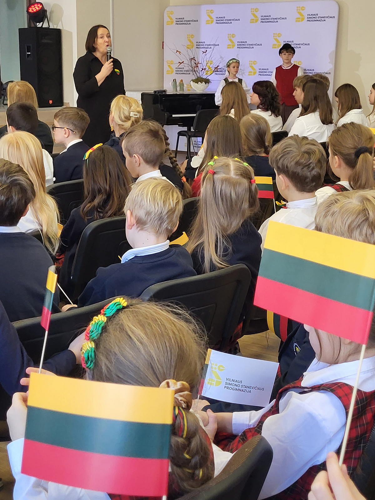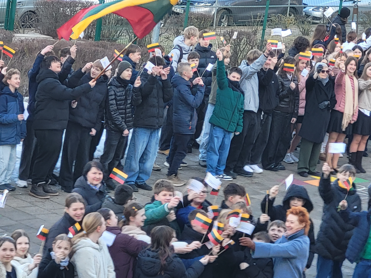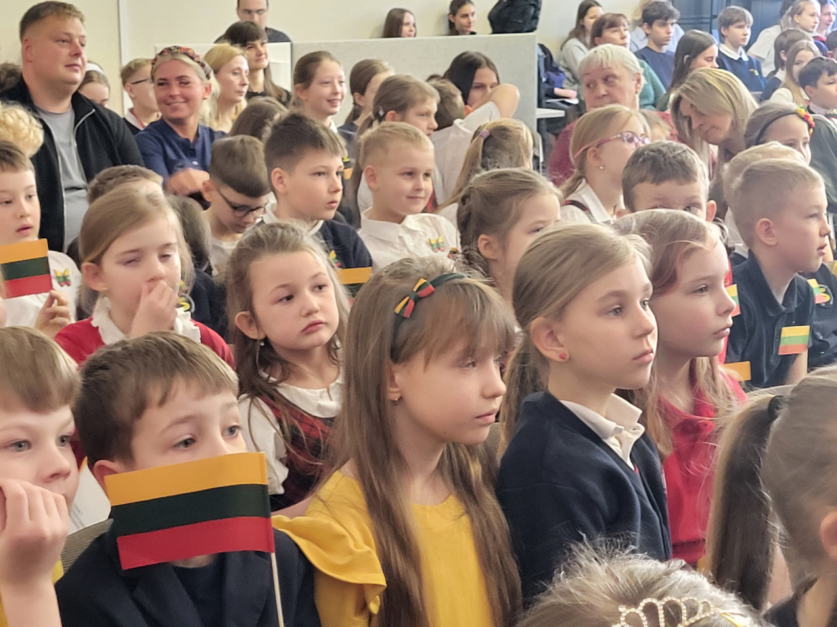 Renginio pradžioje visi susirinkusieji atsistojo ir kartu sugiedojo „Tautišką giesmę“. Mokyklos salėje skambėjo žodžiai apie tiesą, vienybę ir meilę Tėvynei priminė vertybes, kurios vienija tautą.