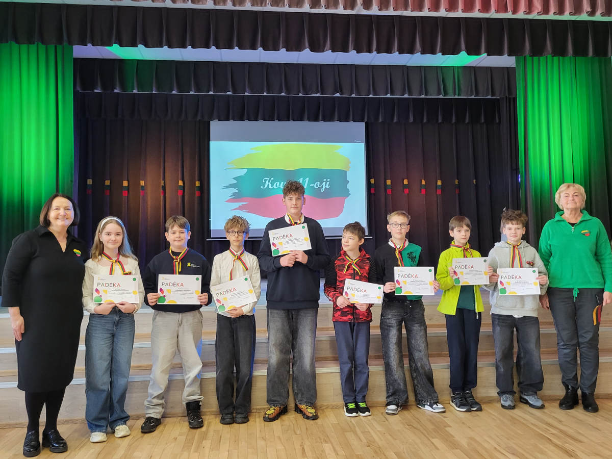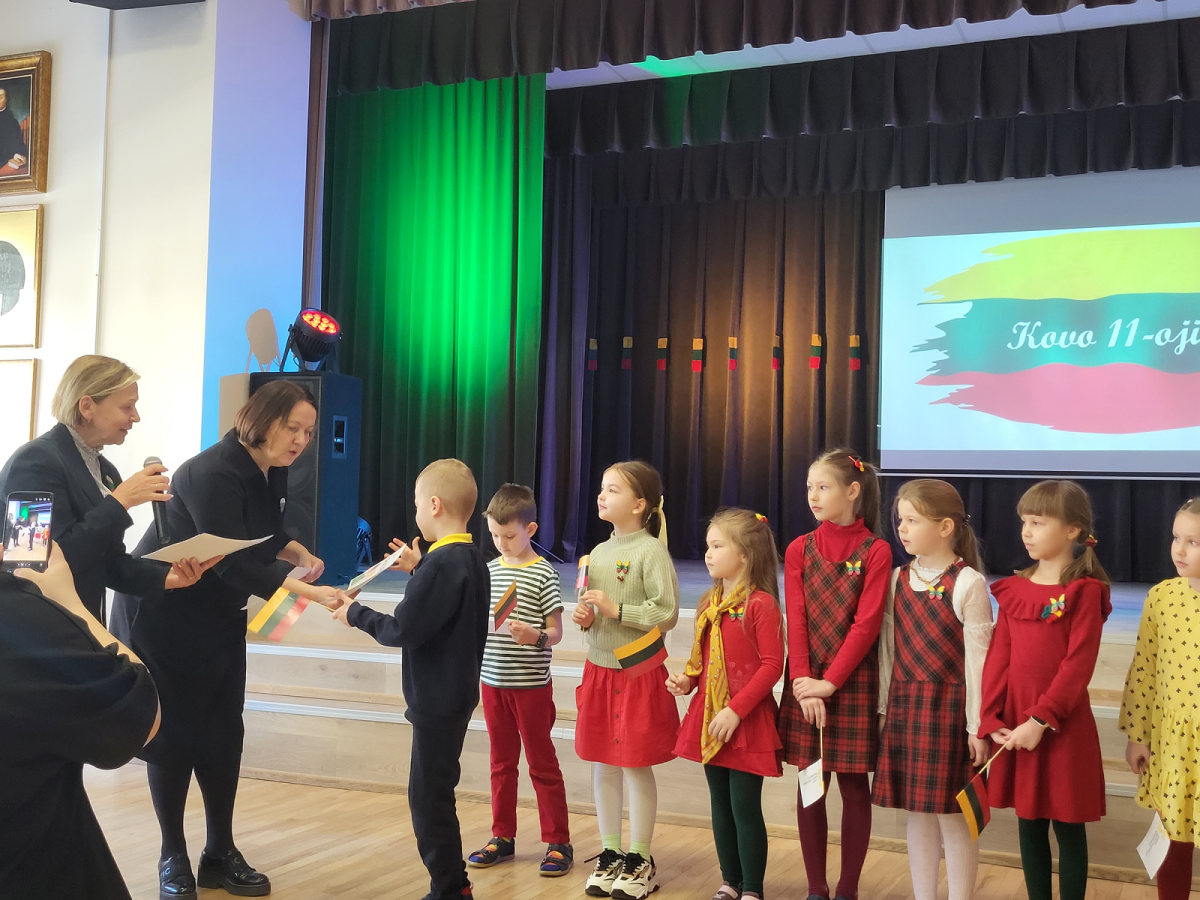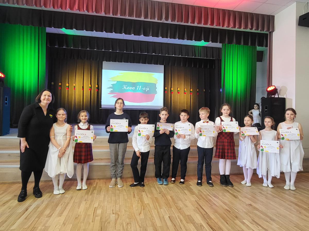 Svarbi renginio dalis buvo mokinių pagerbimas. Mokyklos direktorė Daiva Briedienė pasveikino bendruomenę su Lietuvos nepriklausomybės atkūrimo diena ir įteikė padėkos raštus net 162 mokiniams, kurie pasižymėjo II trimestre puikiais akademiniais pasiekimais. Vienas po kito į sceną kilo mokiniai iš įvairių klasių – nuo pirmokų iki aštuntokų. Jų šypsenos, pasididžiavimas ir gausūs plojimai priminė, kad kiekviena pastanga mokytis ir tobulėti yra svarbi mūsų šalies ateičiai.