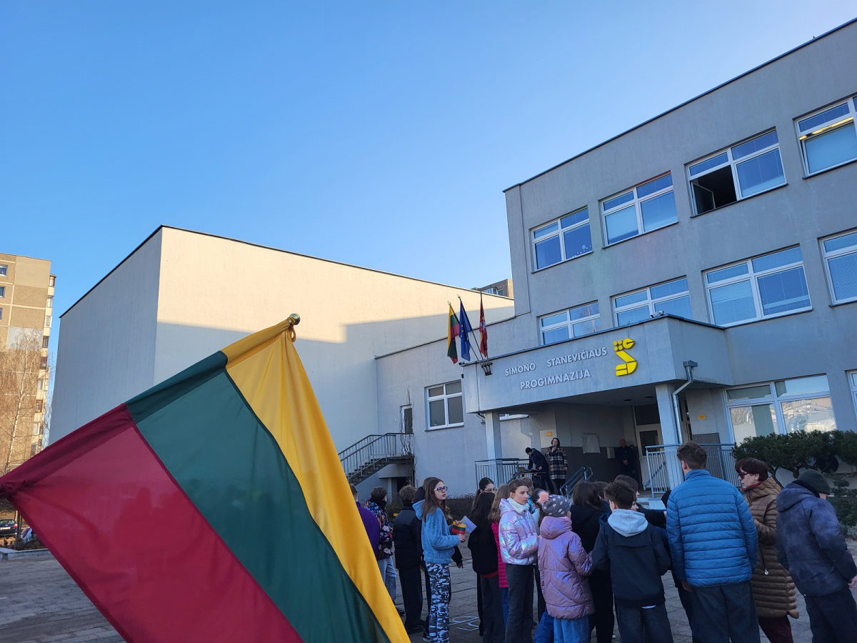 Kovo 10-osios rytas Simono Stanevičiaus progimnazijoje prasidėjo ypatinga nuotaika. Pirmąją pamoką 1-4, 5–8 klasių mokiniai pradėjo giedodami „Tautišką giesmę“.